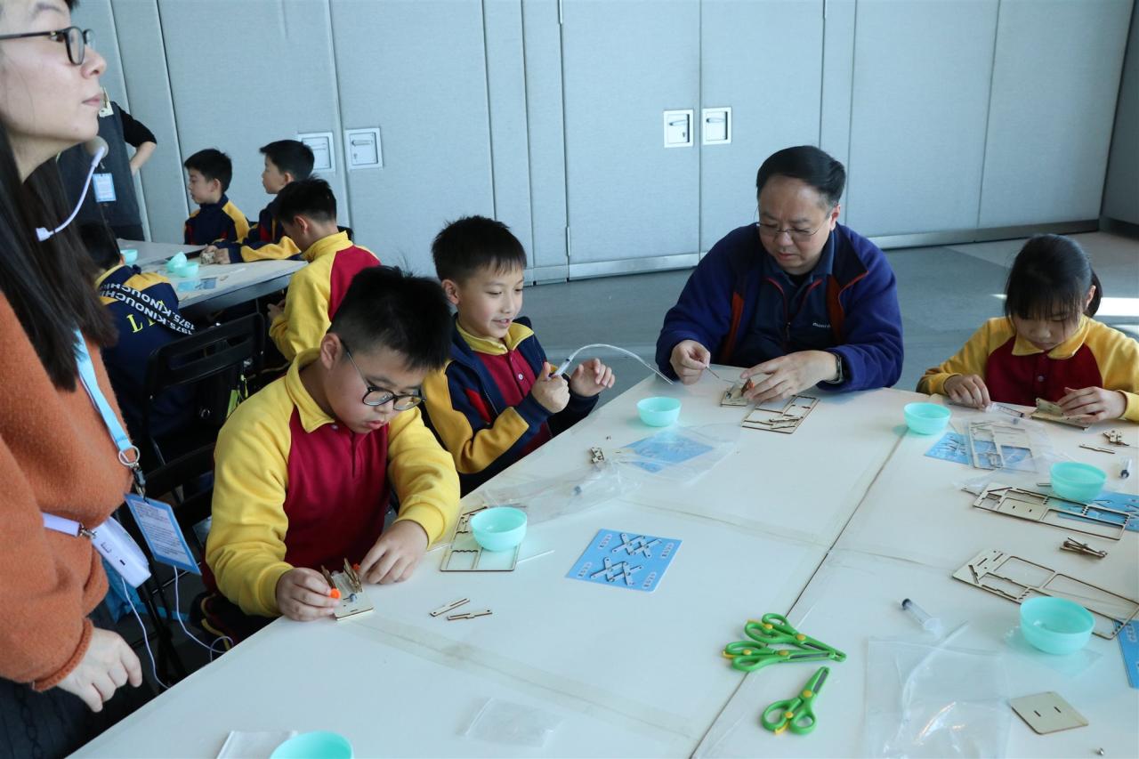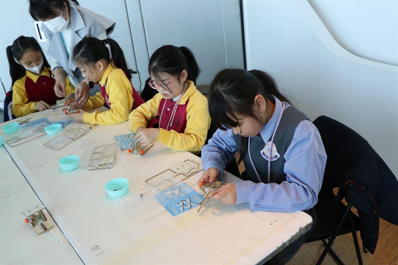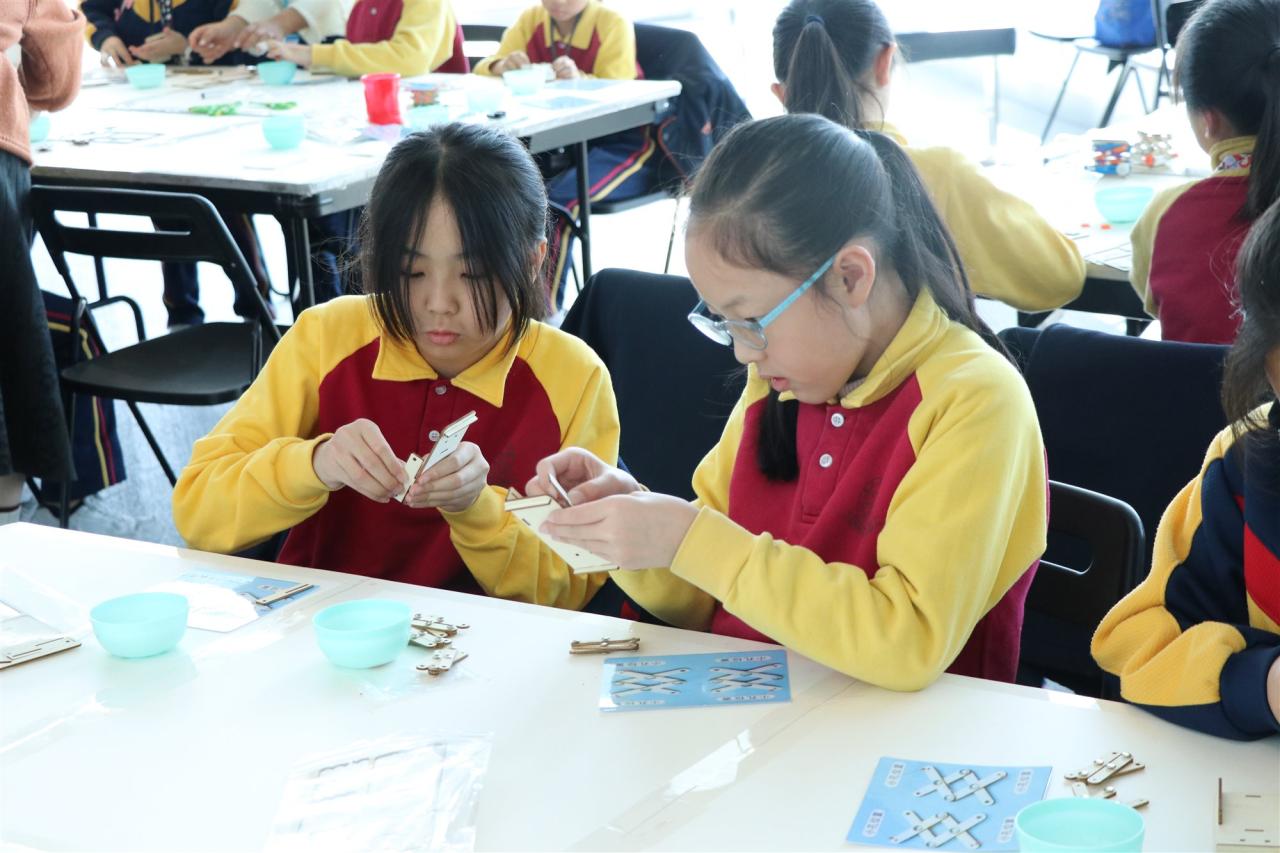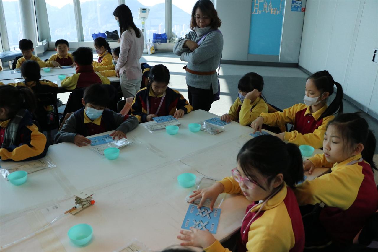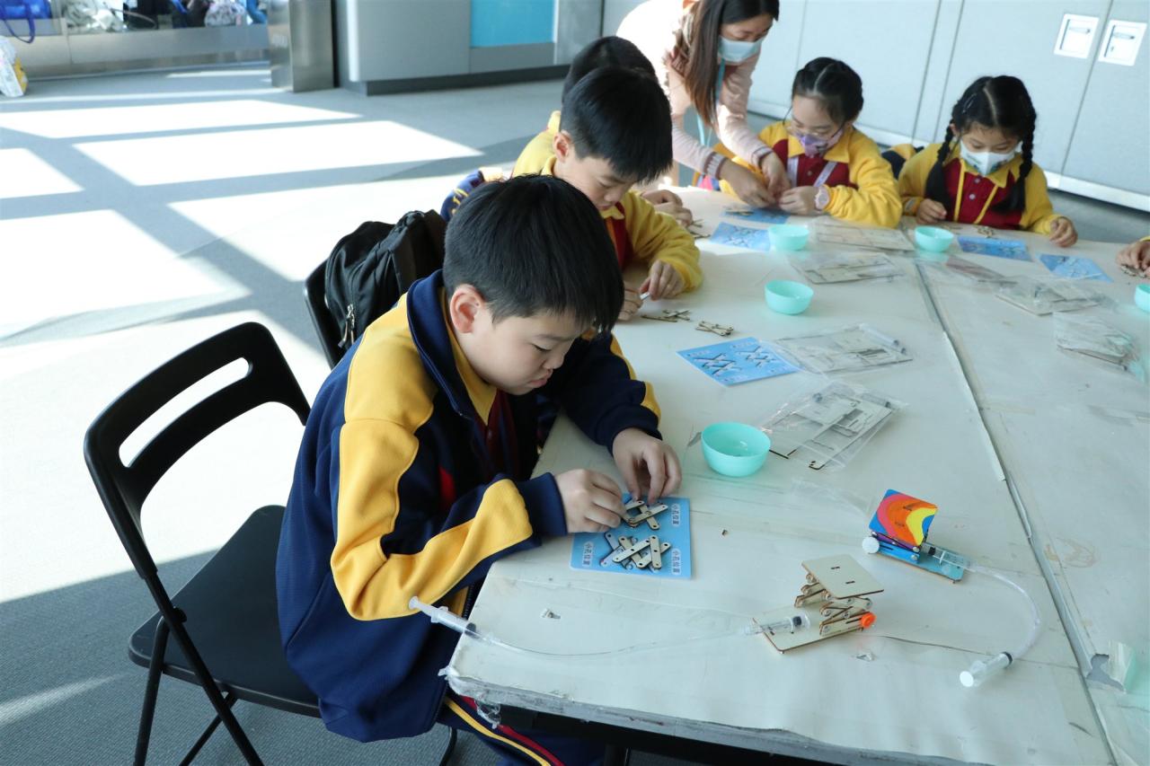三年級同學到訪天際100參與液壓升降台工作坊,學生透過製作模型學習液壓推動原理,提升學生對科學的認識。