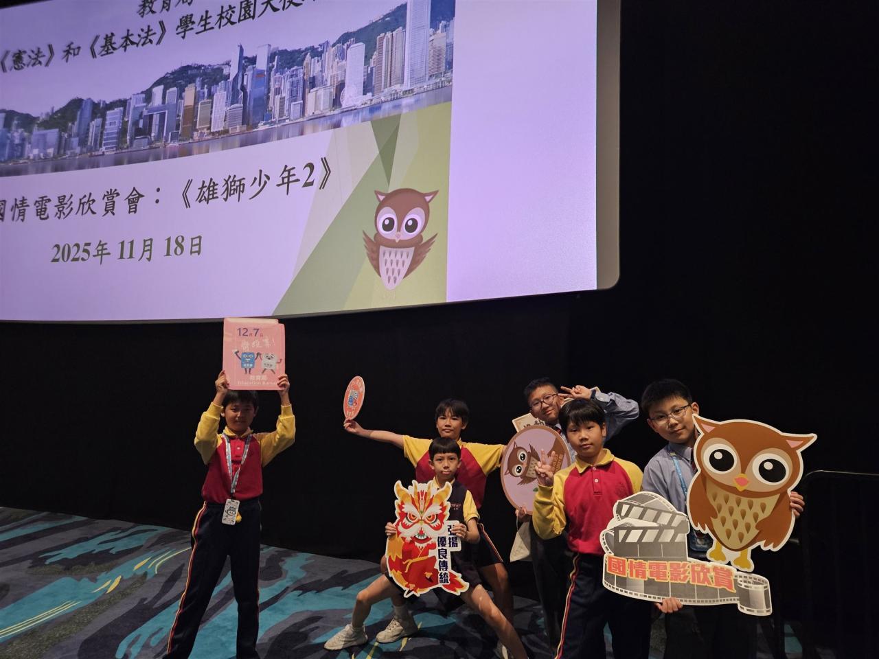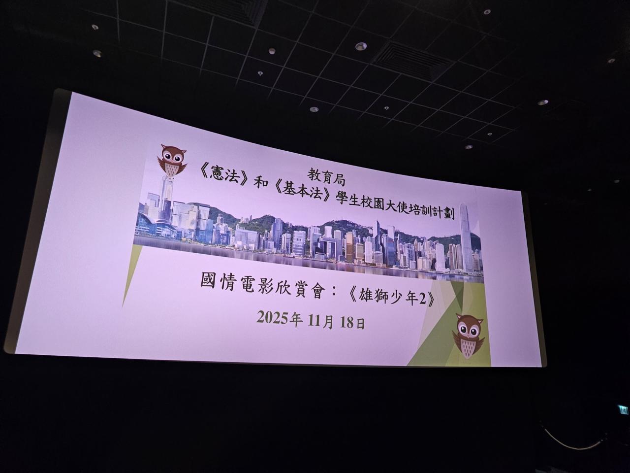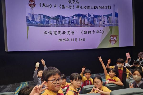 本校老師於2025年11月18日 (星期二)帶領《憲法》和《基本法》學生校園大使到大圍英皇戲院欣賞電影《雄獅少年2》, 期望透過電影欣賞讓學生校園大使感受傳統舞獅文化和中國武術的精神和價值,以及學習在面對困難時展現自強不息的精神,從而加強國民身份認同及建立正確的價值觀。