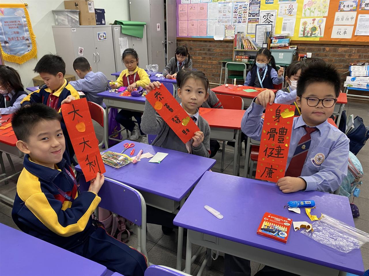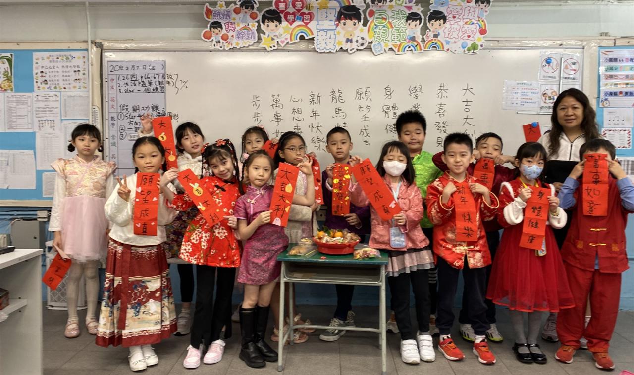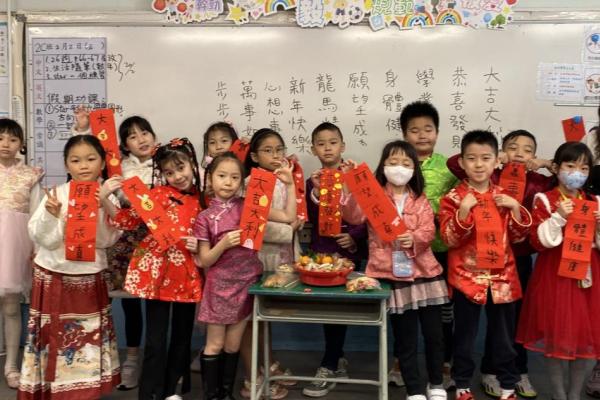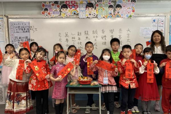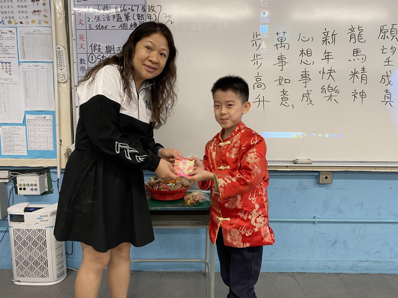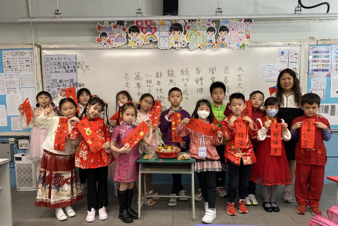 2024-02-02 老師為二年級同學舉行農曆新年趣味活動,當中同學們可穿着中華民族服裝回校參與活動,包括寫揮春、認識全盒等,老師更在紅包內放入糖果送給學生,讓學生充分感受中國傳統節日的氣氛。 公民教育活動
