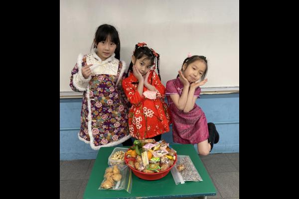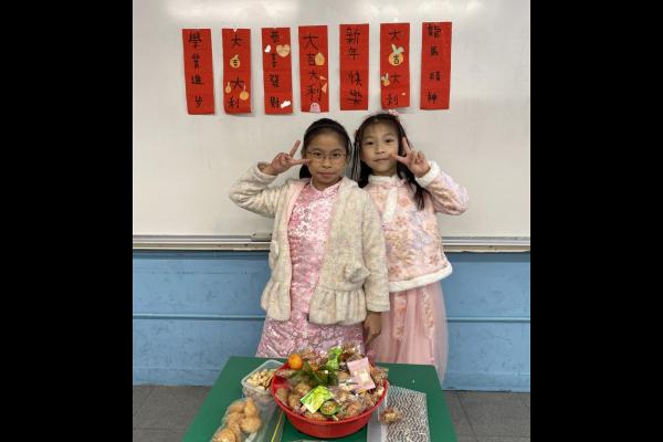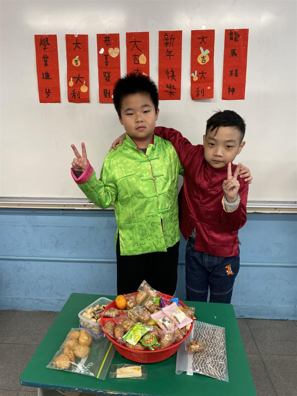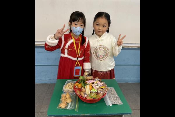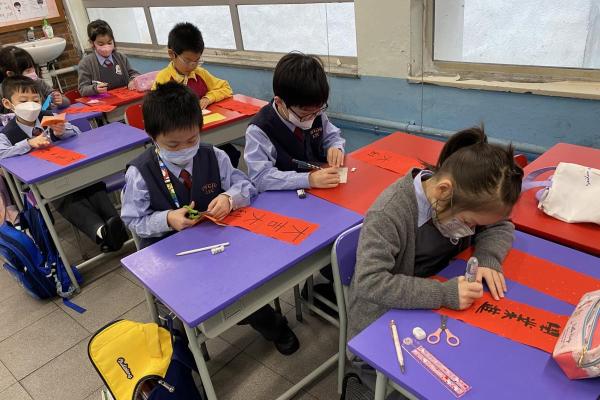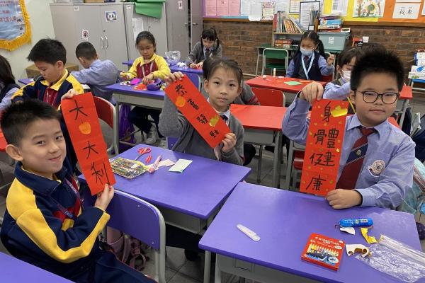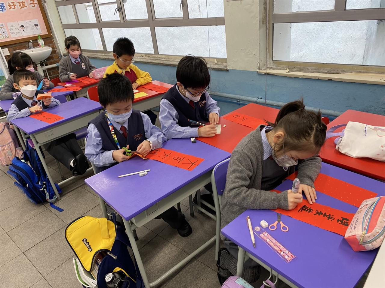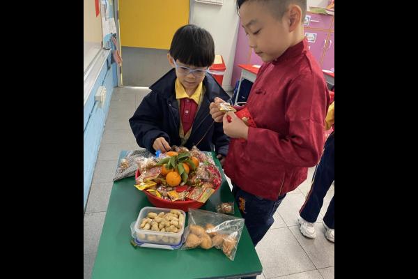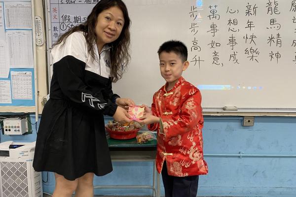 2024-02-02 老師為二年級同學舉行農曆新年趣味活動,當中同學們可穿着中華民族服裝回校參與活動,包括寫揮春、認識全盒等,老師更在紅包內放入糖果送給學生,讓學生充分感受中國傳統節日的氣氛。 公民教育活動