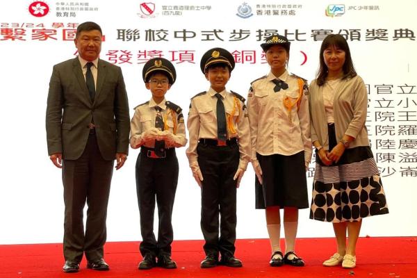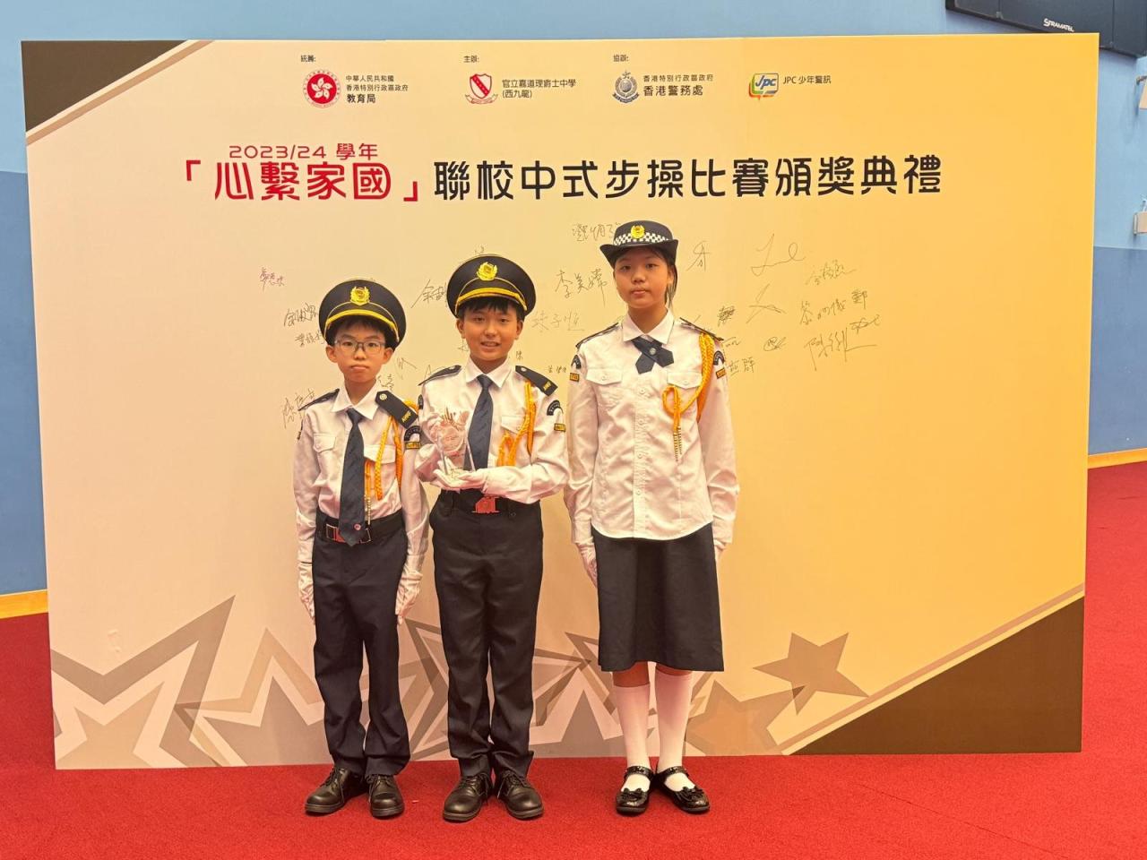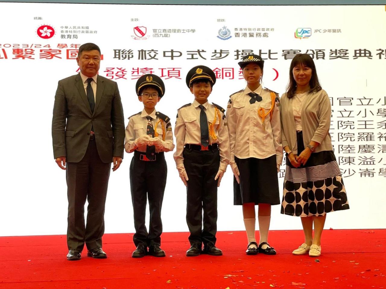 2024-04-20 主辦:教育局本校升旗隊三名隊員參加由教育局統籌、官立嘉道理爵士中學(西九龍)主辦、香港警務處及少年警訊協辦的「心繫家國」-聯校中式步操比賽 (小學組)。頒獎典禮於警官會所舉行,大會邀請了保安局局長鄧炳強先生,GBS,PDSM,JP及教育局常任秘書長李美嫦女士,JP作主禮嘉賓。參賽同學表現出色,首次參賽即勇奪銅獎。銅獎張凱軒 6B孔君澤 6B林洛儀 6B 所有 其他