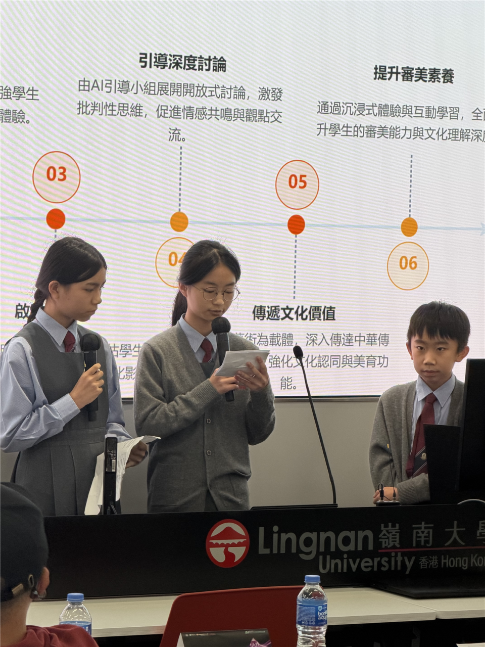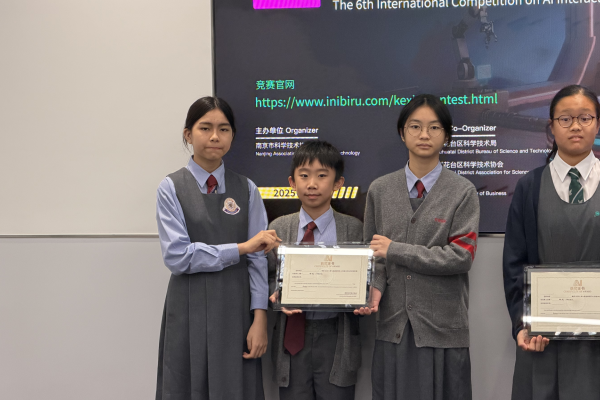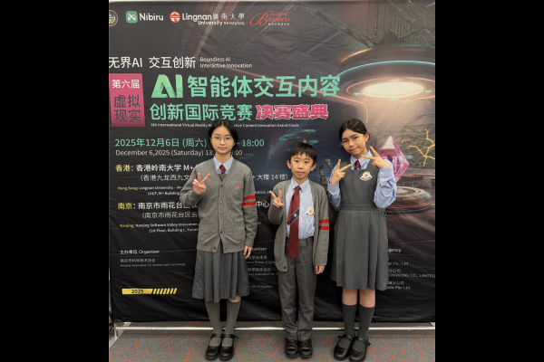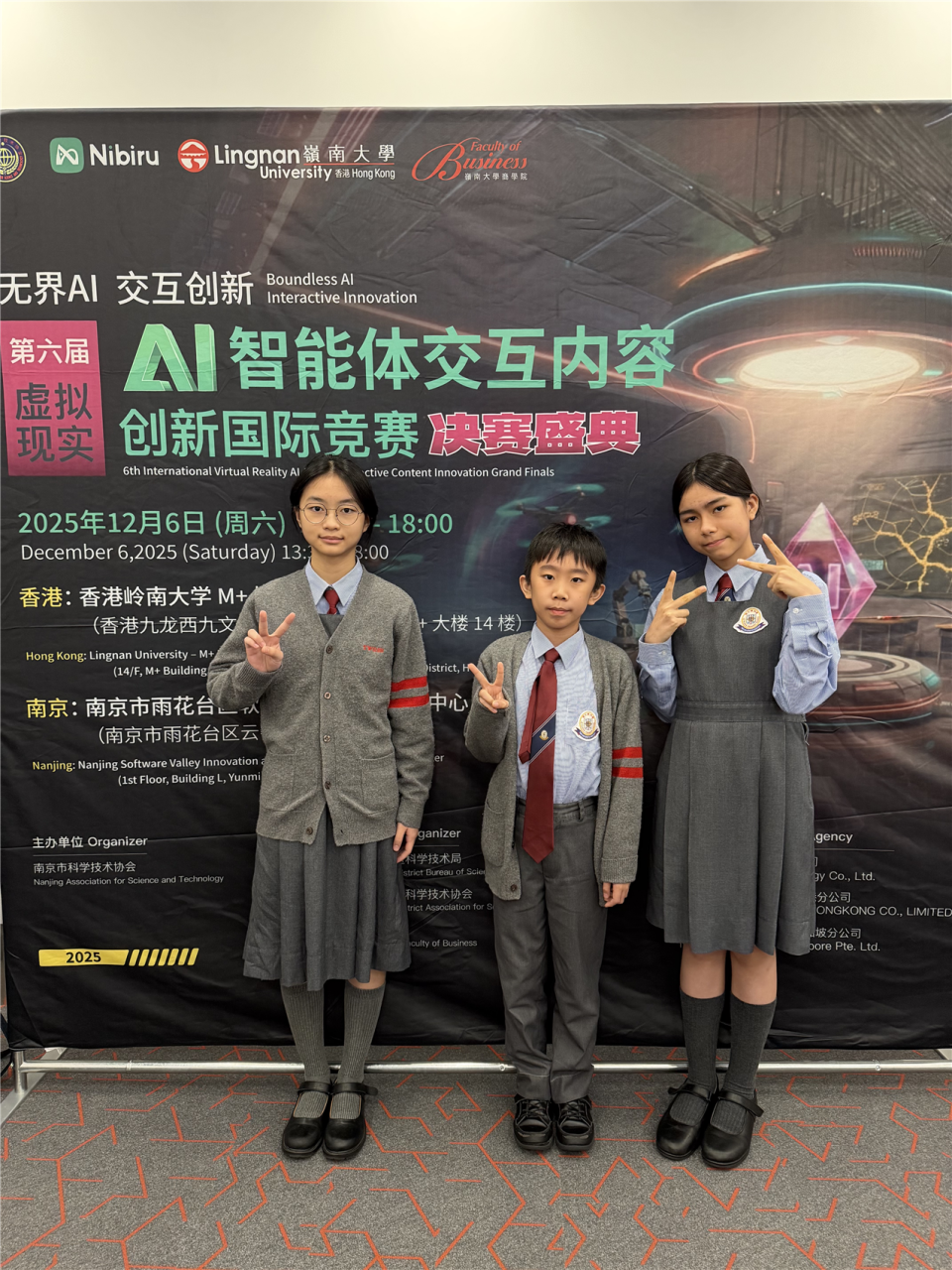 2025-12-06 主辦:南京市科學技術協會主辦、香港嶺南大學商學院協辦本校6B李書羽、6C方富恆及韓穎琳同學參與由南京市科學技術協會主辦、香港嶺南大學商學院協辦的全國性STEAM比賽《第六屆虛擬實境AI智慧體交互內容創新國際競賽》,於2025年12月6日在南京與香港兩地同步連線共同舉行的決賽盛典中進行作品展示,與來自全國超過150隊的大學及中小學隊伍較勁。本校作品於比賽中獲得三等獎。三等獎李書羽 6B方富恆 6C韓穎琳 6C 所有 學術