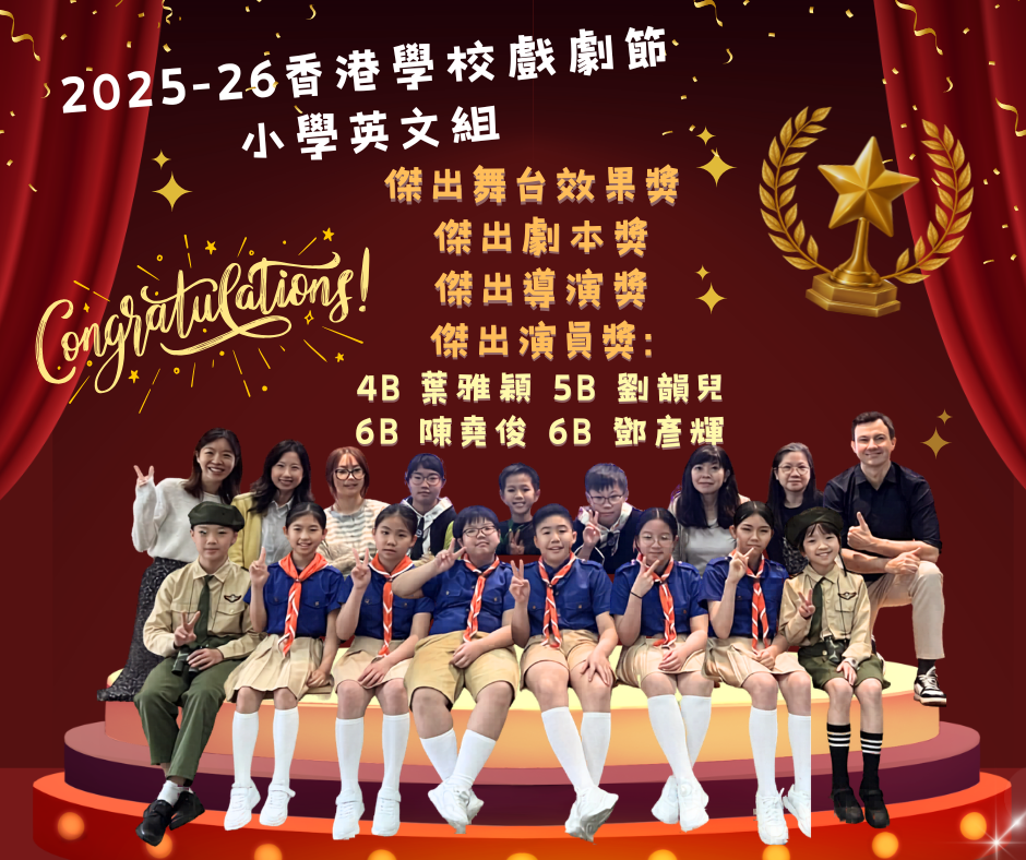 2026-04-17 本校英語話劇校隊在 2025/26年度香港學校戲劇節(小學英文組)中憑藉精彩的演出與團隊合作, 獲得以下多個獎項:✨ 傑出舞台效果獎📜 傑出劇本獎🎬 傑出導演獎🎭 傑出演員獎:4B 葉雅穎 5B 劉韻兒 6B 陳堯俊 6B 鄧彥輝衷心祝賀所有參演的同學及幕後工作的老師們!團隊們由劇本構思、舞台效果到演技磨練都付出了無數汗水。這些獎項是對同學們努力的肯定,讓我們一起為這群努力不懈的小小演藝家鼓掌! 所有 學術