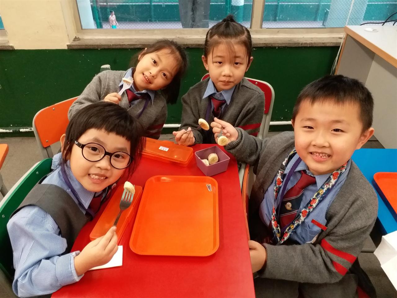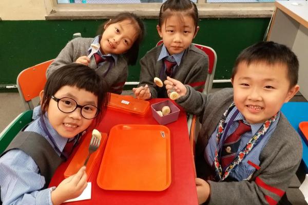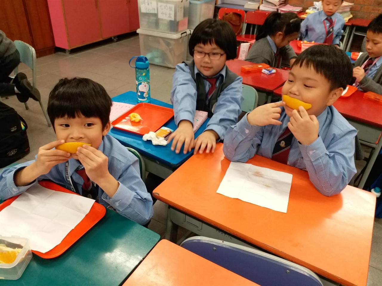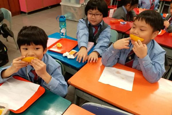 既然學生對吃喝玩樂很感興趣,故本校教師善用學生平日生活中吃喝玩樂的真切體驗來培養他們寫作的興趣,豐富寫作的素材。如圖中所見,本校教師於寫作課上安排學生利用五感來吃水果。吃水果的過程中,學生非常投入,不但對寫作的興趣提高了,也能抓住寫作的素,運用合適的形容詞寫作句子。