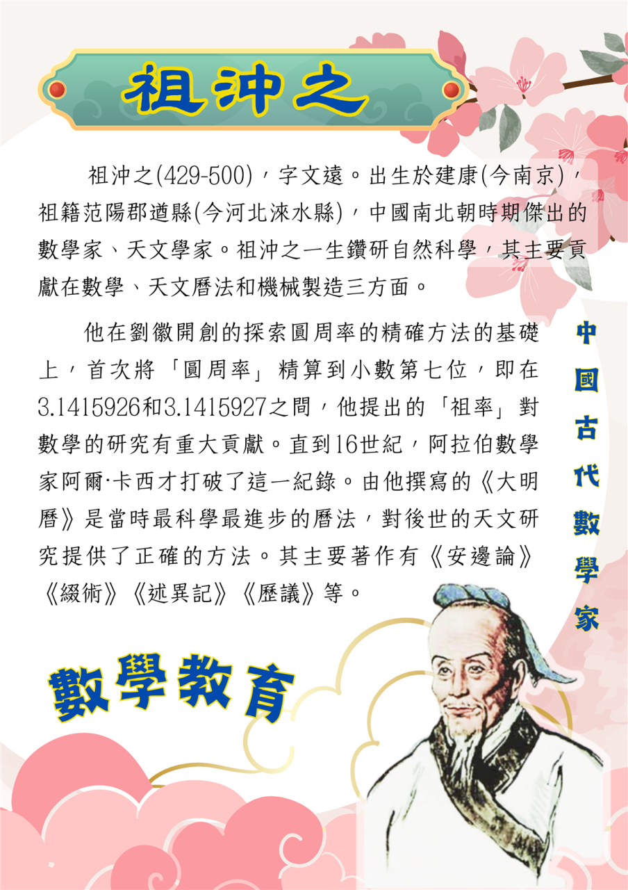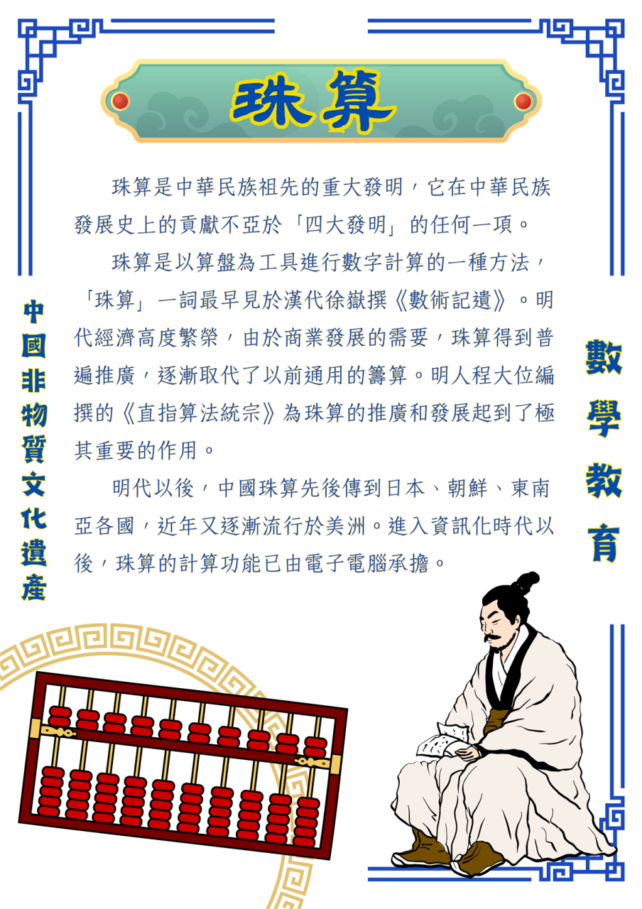 - 數學科除了善用科本閱讀工作紙,每級每學期至少開展一次師生共讀活動,提升學生的閱讀興趣。另外,數學科亦於走廊張貼中國古代數學知識的海報,讓學生進一步瞭解中國數學的發展。