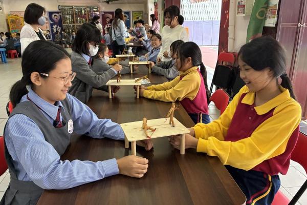 12月12日是本校四年級跨課程主題學習《香港今昔》的「懷舊遊戲日」。老師們在操場和禮堂設置了不同的童玩區,讓同學們體會舊有玩具的樂趣。在家長義工的協助下,同學們進行了精彩的竹節人大戰和陀螺比賽,玩了抓子、翻花繩,還嘗試了跳橡皮筋和滾鐵圈,而最受歡迎的要屬泡泡機了,看着一顆顆滿載小朋友笑語的彩虹泡泡愈飛愈遠,愈飛愈高,大家都忍不住雀躍歡呼。 透過「懷舊遊戲日」,同學們發現只要肯發揮創意,動手做一做,大家都能自製出有趣的小玩具。