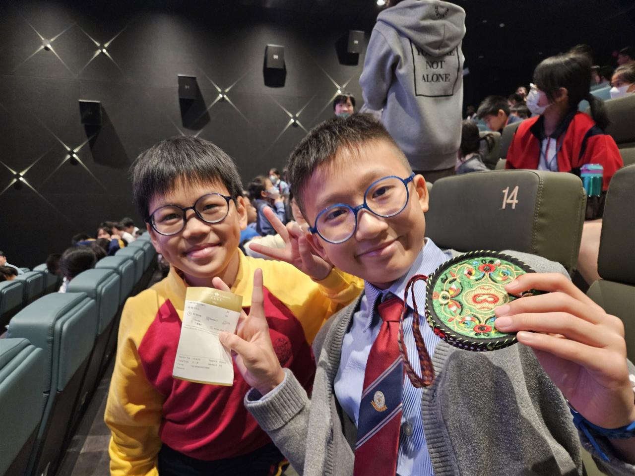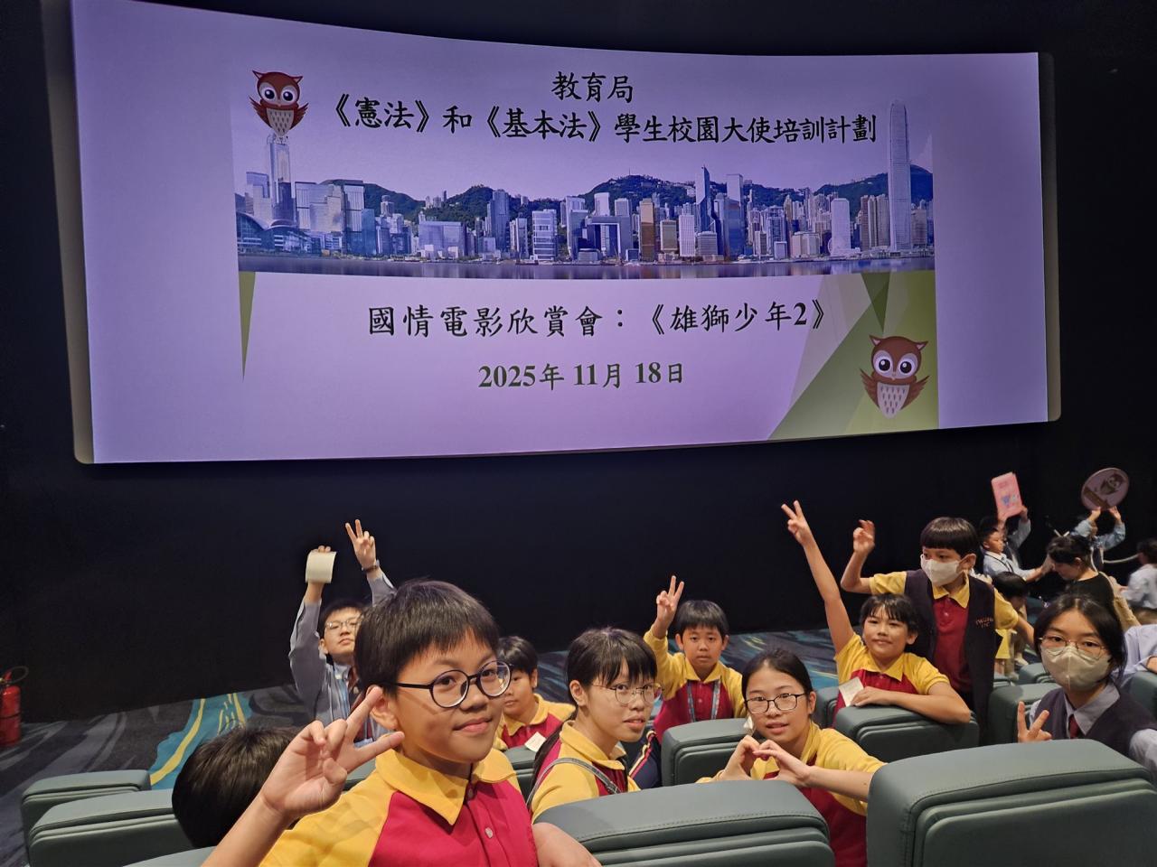 本校老師於2025年11月18日 (星期二)帶領《憲法》和《基本法》學生校園大使到大圍英皇戲院欣賞電影《雄獅少年2》, 期望透過電影欣賞讓學生校園大使感受傳統舞獅文化和中國武術的精神和價值,以及學習在面對困難時展現自強不息的精神,從而加強國民身份認同及建立正確的價值觀。