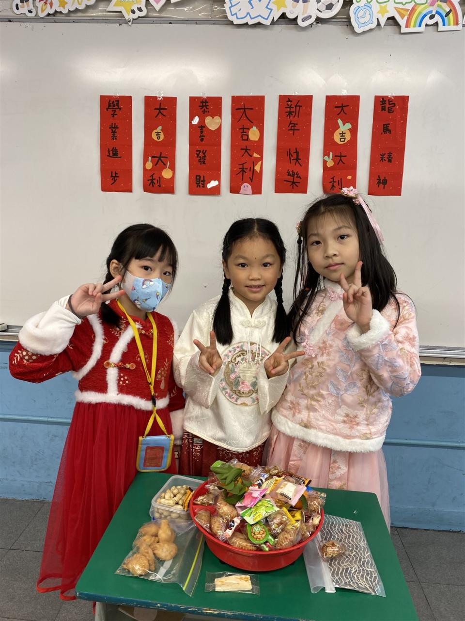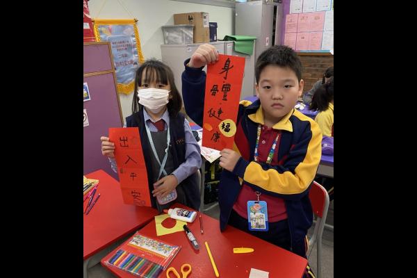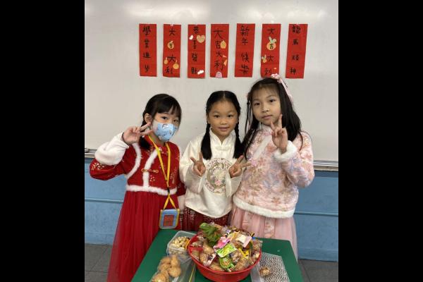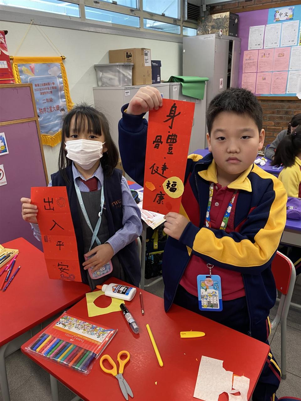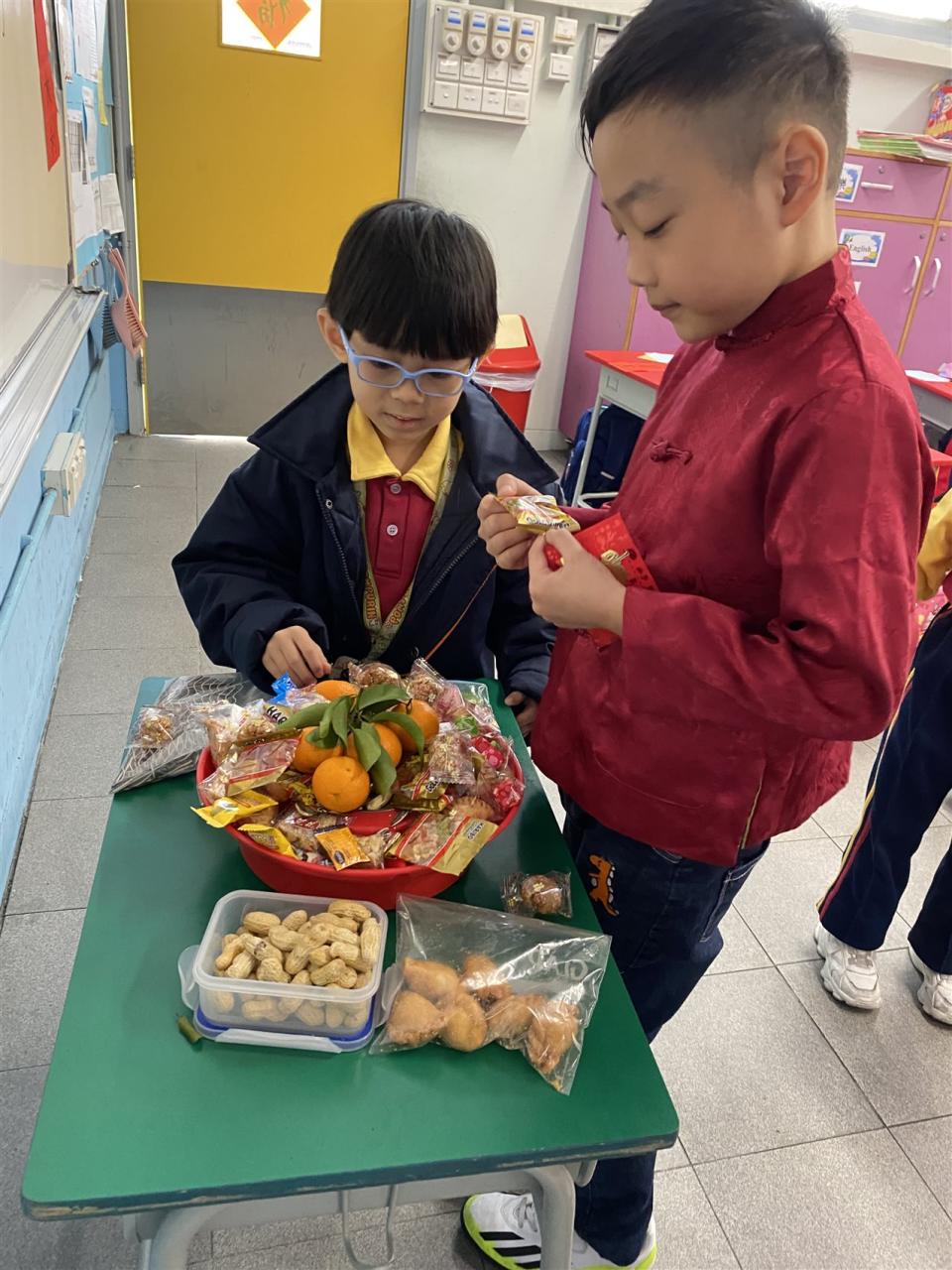 2024-02-02 老師為二年級同學舉行農曆新年趣味活動,當中同學們可穿着中華民族服裝回校參與活動,包括寫揮春、認識全盒等,老師更在紅包內放入糖果送給學生,讓學生充分感受中國傳統節日的氣氛。 公民教育活動