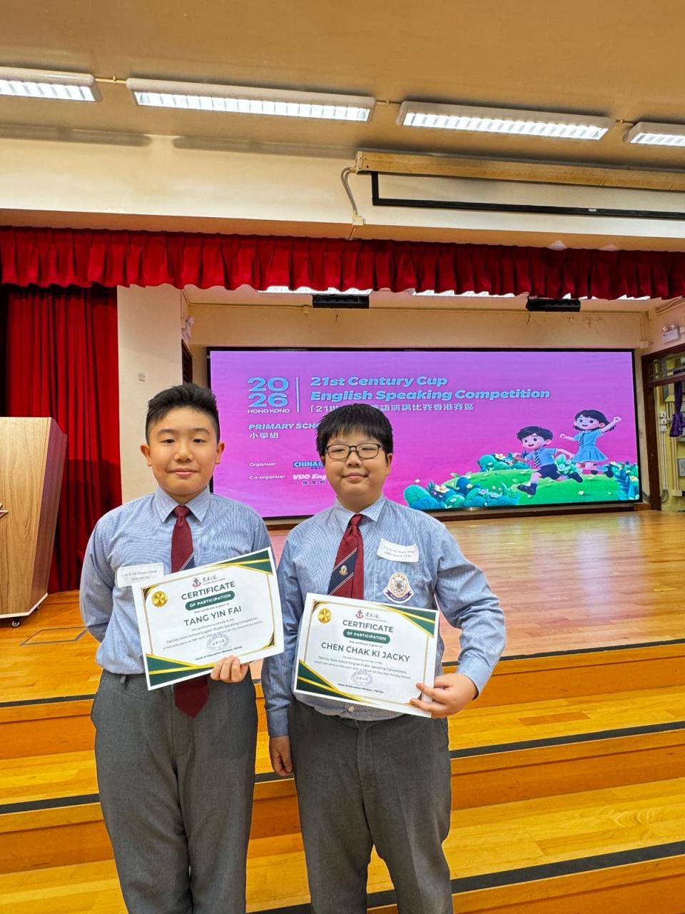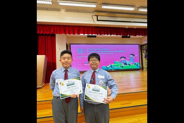 2026-04-17 本校兩位優秀的演說代表- 5B班陳澤琪同學及6B班鄧彥輝同學早前代表學校參加了「21世紀杯」英語演講比賽(香港賽區)東華三院聯校初賽。兩位代表們在舞台上自信地用英語演說,展現出努力練習的成果,老師和同學們都為你們感到驕傲!特別恭喜6B 班鄧彥輝同學 憑著出色的表現成功晉級準決賽(Semi-final)!希望彥輝在接下來的賽事中繼續享受舞台,加油! 所有 學術