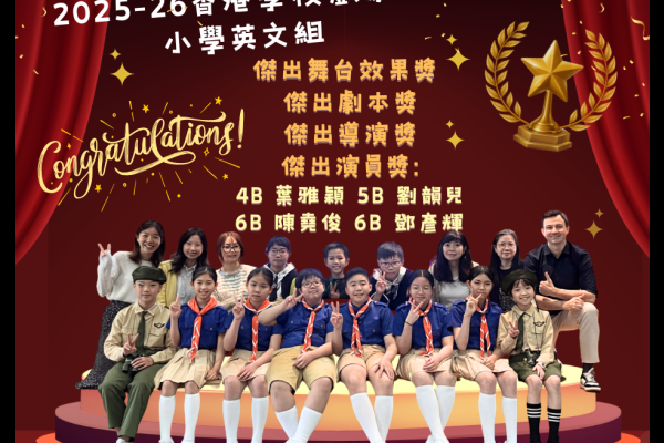 2026-04-17 本校英語話劇校隊在 2025/26年度香港學校戲劇節(小學英文組)中憑藉精彩的演出與團隊合作, 獲得以下多個獎項:✨ 傑出舞台效果獎📜 傑出劇本獎🎬 傑出導演獎🎭 傑出演員獎:4B 葉雅穎 5B 劉韻兒 6B 陳堯俊 6B 鄧彥輝衷心祝賀所有參演的同學及幕後工作的老師們!團隊們由劇本構思、舞台效果到演技磨練都付出了無數汗水。這些獎項是對同學們努力的肯定,讓我們一起為這群努力不懈的小小演藝家鼓掌! 所有 學術