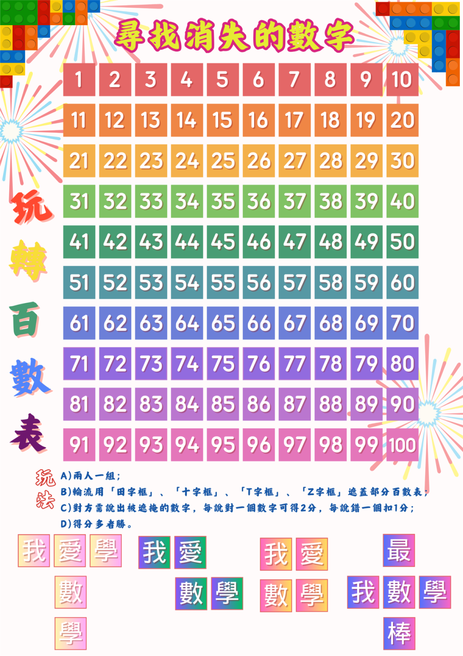 - 數學科除了善用科本閱讀工作紙,每級每學期至少開展一次師生共讀活動,提升學生的閱讀興趣。另外,數學科亦於走廊張貼中國古代數學知識的海報,讓學生進一步瞭解中國數學的發展。